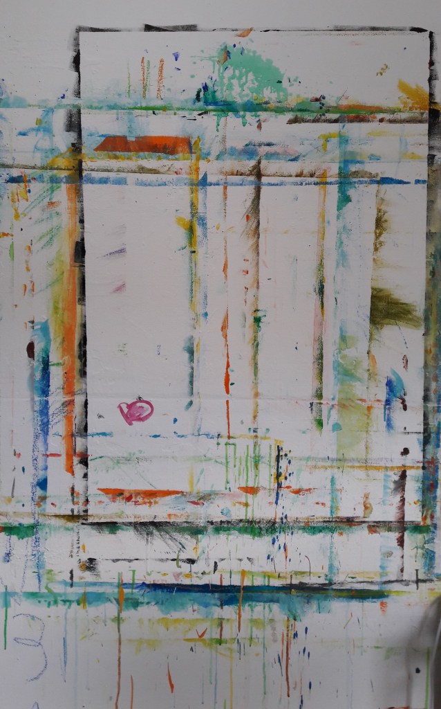 Im Atelier die Wand, an der die Schüler arbeiten. Woche für Woche pinnt ein anderer Mensch sein Blatt daran und legt all sein Mühen und Werken hinein, seine Wünsche, seine Kreativität, vielleicht auch seinen Schmerz. Und jeder hinterlässt eine andere Leerstelle, sichtbar nur durch den übrig gebliebenen Rand. Nur an diesem Rand kann man versuchen, den Menschen dahinter zu erahnen. Die Farben, die er benutzt, die Energie, mit der er über das Blatt hinausgemalt hat. Arbeitete er mit hellen und fröhlichen Tönen oder war sein Bild düster und traurig? Hat er ganz vorsichtig, zart nur hauchdünne Striche hinterlassen, in dem Übereinander der Ränder kaum auszumachen? Oder hat er sich und die Farbe verschwendet, in wilden Klecksen und herabrinnender Farbe Präsenz für sich beansprucht? So sind auch die Spuren, welche die Menschen auf Erden hinterlassen. Und egal, wie der Mensch gemalt und gelebt hat, erst im Zusammenspiel aller ergibt sich ein vollständiges Bild. Doch nur Gott allein weiß, was auf den einzelnen Blättern, den Seelen der Menschen gleich, dargestellt war.