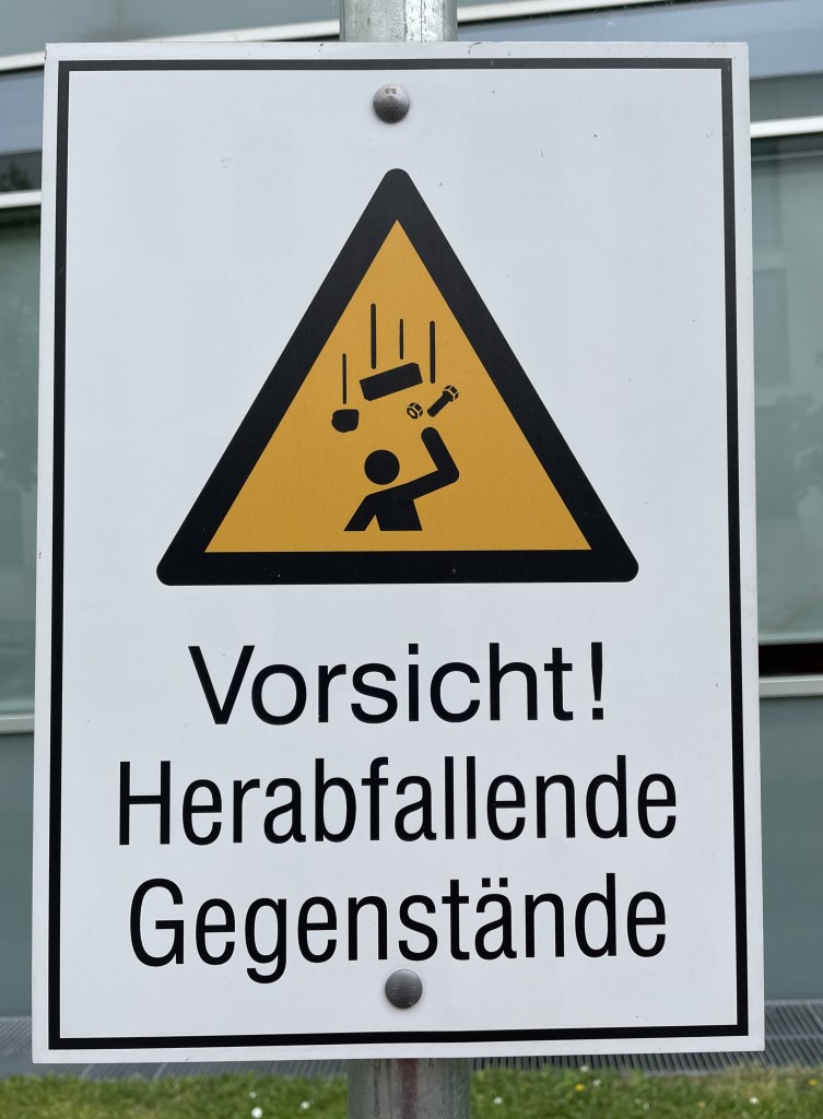 Das Leben ist voller Gefahren, die der Mensch in seiner Beschränktheit gar nicht überblicken kann. Wie gut, dass es für alle Eventualitäten die passenden Gefahrenhinweisschilder gibt. Aber was sind schon ein paar Gegenstände, wenn einem der ganze Himmel auf den Kopf fallen könnte? Der Himmel mit all seinen Engeln und Heerscharen und wovon er sonst noch bevölkert wird. Nicht, dass wir uns in unserer so gemütlich eingerichteten Welt gar noch mit Transzendenz befassen müssen. Dass wir konfrontiert werden mit dem, was es da hinter all den materiellen Dingen noch geben könnte. Davor warnt kein Schild, davon können wir jederzeit überrascht werden. Durch einen freundlichen Blick, ein einfaches Lächeln, ein paar nette Worte. Durch Wärme und Liebe. Stellen wir uns der Gefahr!