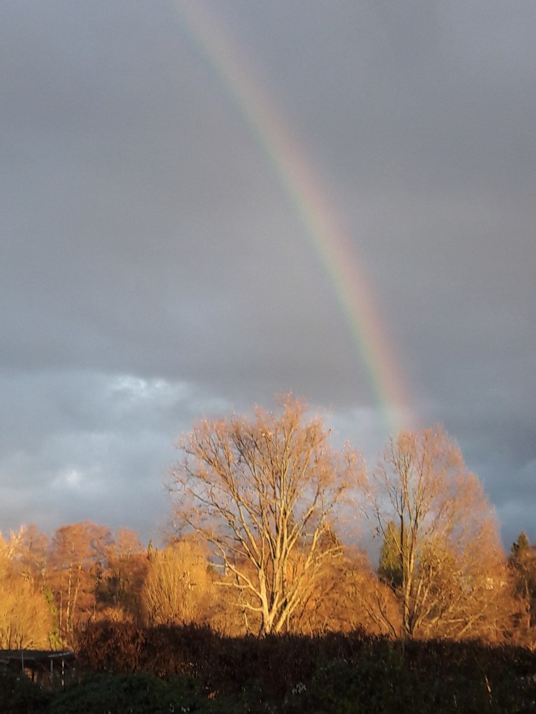 Ein farbiger Bogen am Himmel, der Menschen zu Hoffnung veranlasst. Wieso konnte er so populär werden? Gerne würde ich auf den Bogen verzichten, bedeutet sein Erscheinen doch immer, dass man dieses Hoffnungszeichens bedarf. Dass man erst den Regen überstehen muss, um sich danach im Sonnenschein zu baden. Durch die Dunkelheit gehen, um das Licht zu sehen. Für einen Regenbogen ist eben immer beides nötig, der Regen und die Sonne, die Verzweiflung und die Aussicht auf Rettung. Ist es naiv, sich ein Leben im Glanz der Sonne zu wünschen? Sich in einen Garten Eden zu träumen, den man nie verlassen hat? Nun, da das nicht in der Macht unserer Entscheidung liegt, ist es vielleicht doch besser, den Blick in den Himmel zu richten und sich wenigstens über die Farben des Regenbogens zu freuen.