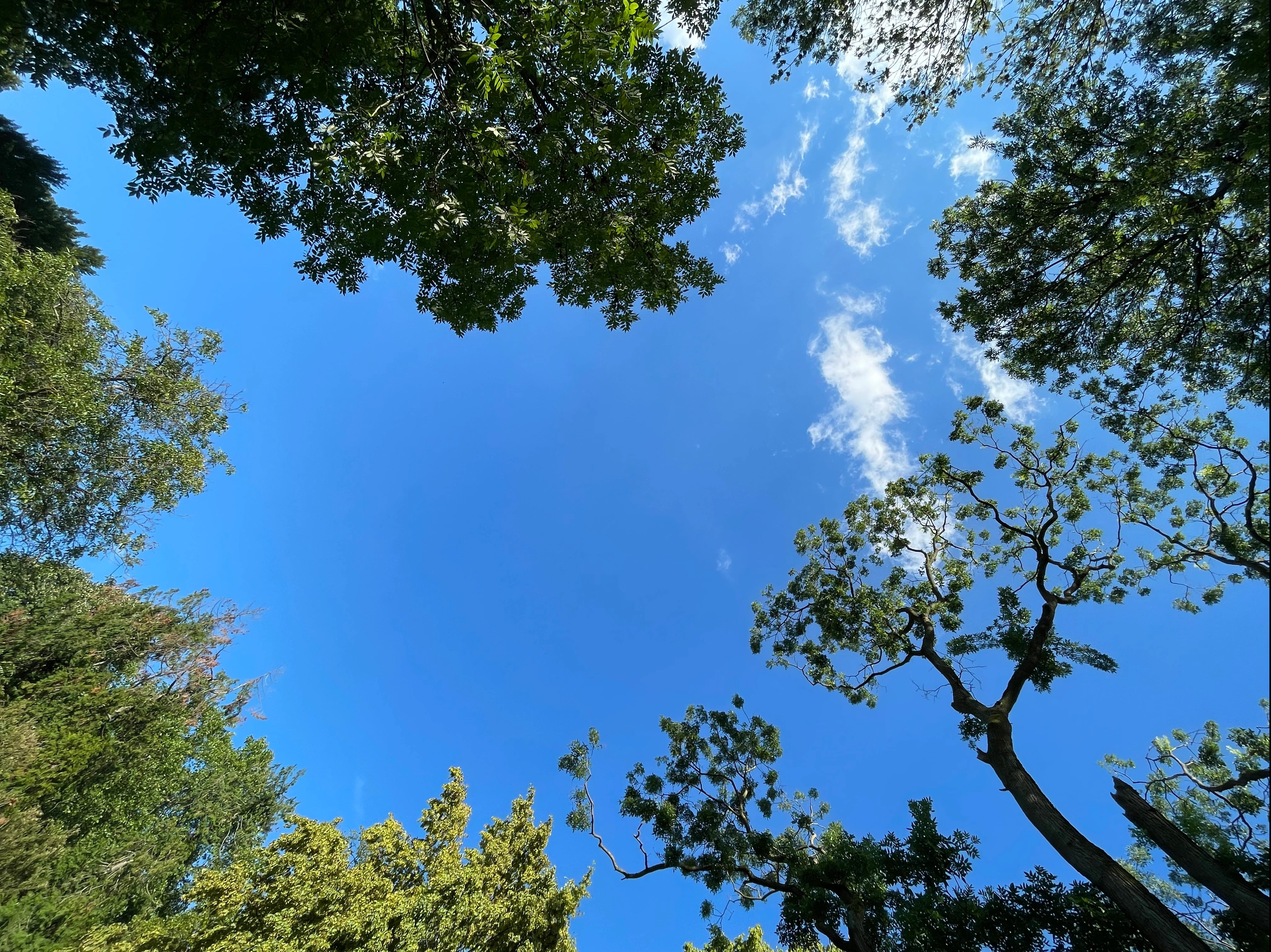 Von Bäumen schützend umschlossen öffnet sich der Blick in den Himmel: ein Ort des Friedens auf Erden. Die Schatten spendenden Riesen beugen sich über mich wie wohlwollende Väter, während mein Blick weiter hinaufgeht, durch sie hindurch in die Unendlichkeit. Schatten und Licht treffen im angenehmsten Verhältnis aufeinander und geben mir ein Gefühl von Stimmigkeit in einer sonst so zerrissenen Welt. Hier wird der philosophische Olivenhain spürbar.