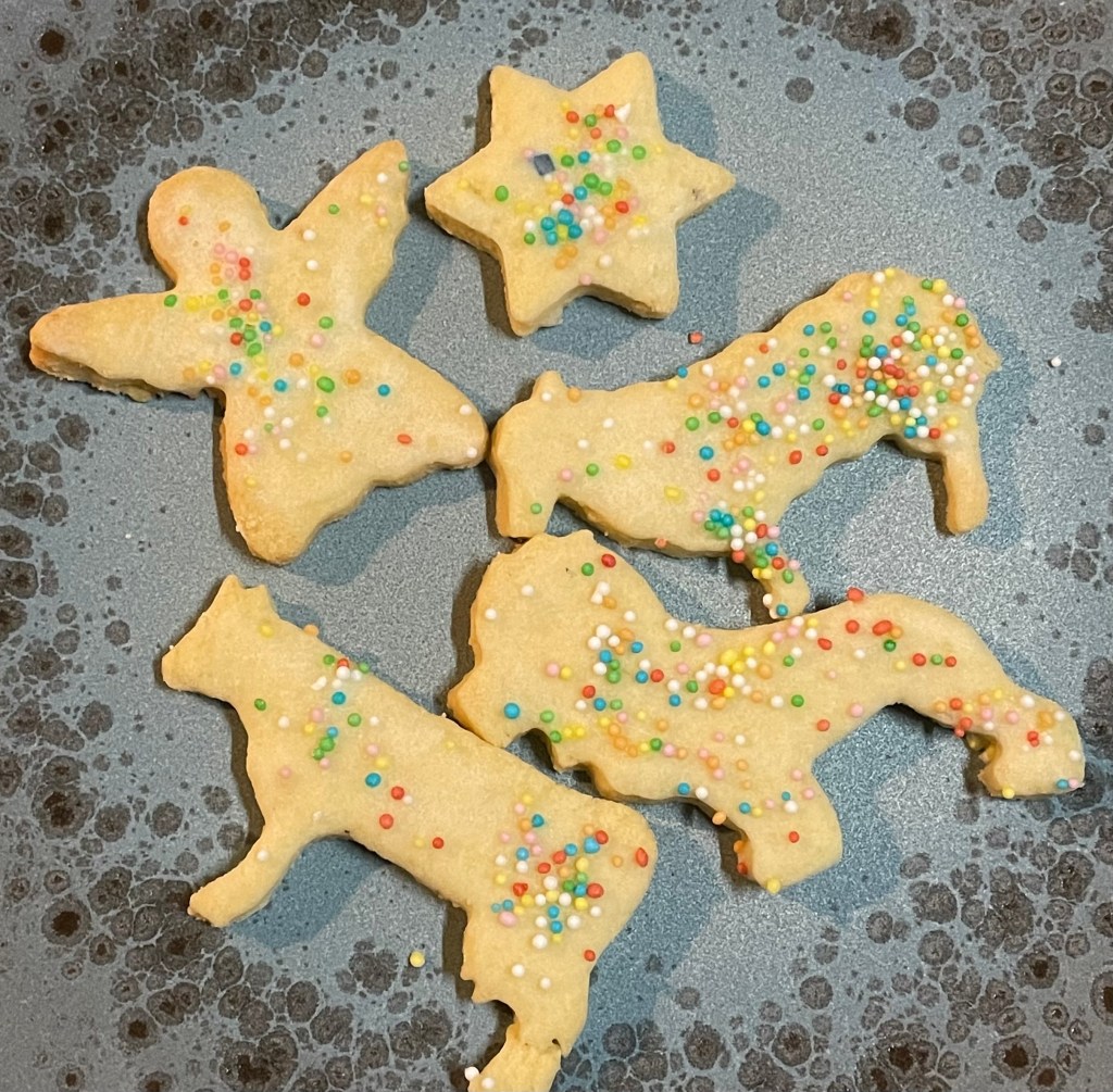 In der Weihnachtsbäckerei den himmlischen Frieden gefunden. Einträchtig liegen sie nebeneinander, Kuh und Löwe*, ein Lamm ist ebenso dabei. Der Engel, der die frohe Botschaft verkündet und über allem ein Stern. Auf dem Plätzchenteller gestaltet sich so einfach, was uns im alltäglichen Leben Schwierigkeiten bereitet. Wie bringen wir den Frieden in die Welt? Nicht mit Plätzchen, aber vielleicht indem wir das, was Weihnachten wirklich ausmacht, erkennen. Das Glitzern, den Zuckerguss und den Konsum einmal beiseite lassen, um das Kind in der Krippe zu sehen. Und dies nicht nur einmal im Jahr, sondern Tag für Tag immer wieder neu.