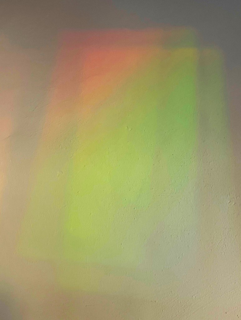 Einfaches Sonnenlicht, gespalten in Strahlen verschiedener Wellenlänge, malt zauberhafte Bilder an die weiße Wand. Ich wünschte mir auch diese Fähigkeit, im Einfachen die Varietät zum Vorschein zu bringen, das Alltägliche aufleuchten zu lassen und die verborgene Kraft in den Dingen sichtbar zu machen. Damit auch andere hinter das Äußere dieser Welt blicken können.