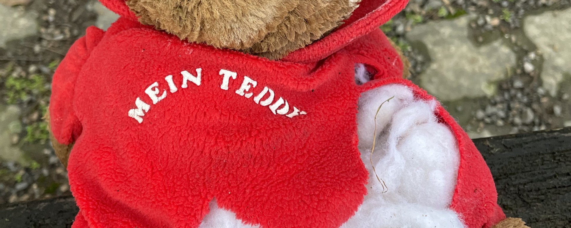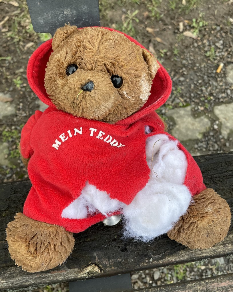 Große braune Augen blicken mich traurig an, am Wegesrand vergessen, verloren, verwundet. Welche Geschichte mag sich hinter diesem verlassenen Teddy verbergen? Ein Drama um Verlust mit vielen Tränen und tröstenden Worten, die dem Schmerz hoffentlich etwas entgegenzusetzen hatten. Erinnert man sich an die eigene Kindheit zurück, gibt es bei vielen wohl ähnliche Szenen, in denen der Verlust eines geliebten Gegenstandes zu schierer Verzweiflung führte. Im kindlichen Ausgeliefertsein an die Gefühle als Katastrophe durchlebt. Heute wäre man froh, wüsste man das Unglück dieser Welt auf Kuscheltiere beschränkt.