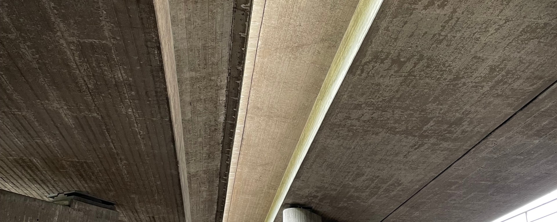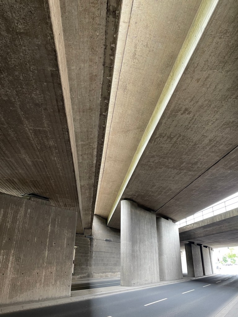 Klare Struktur, Lichtführung, steigende Linien – alles scheint hier auf etwas Höheres hin ausgerichtet zu sein. Doch ist dieser Ort nicht für den Aufenthalt gemacht. Von links nach rechts, von rechts nach links sausen motorisierte Menschen fernen Zielen auf der Horizontale entgegen. Während sich mein Blick nach oben richtet, dem Licht entgegen.