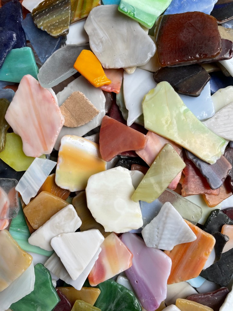Da liegt es in Scherben, das Glück. Bunte Mosaik-Glassteine, die nur darauf warten, zu etwas Größerem zusammengesetzt zu werden. Doch ehe es soweit ist, sollte man jede einzelne Scherbe in die Hand nehmen und sich freuen. Sich freuen über die Möglichkeiten die darin stecken und die verschiedenen Formen, Farben, Strukturen in ihrer Vielfalt genießen. Jede einzelne Scherbe hat es verdient, wahrgenommen zu werden. Jede wird ihren Platz finden und zusammen mit den anderen ein Bild ergeben, ein Ganzes. Gleich uns Menschenkindern, die wir die Teile des großen Welt-Mosaiks sind.