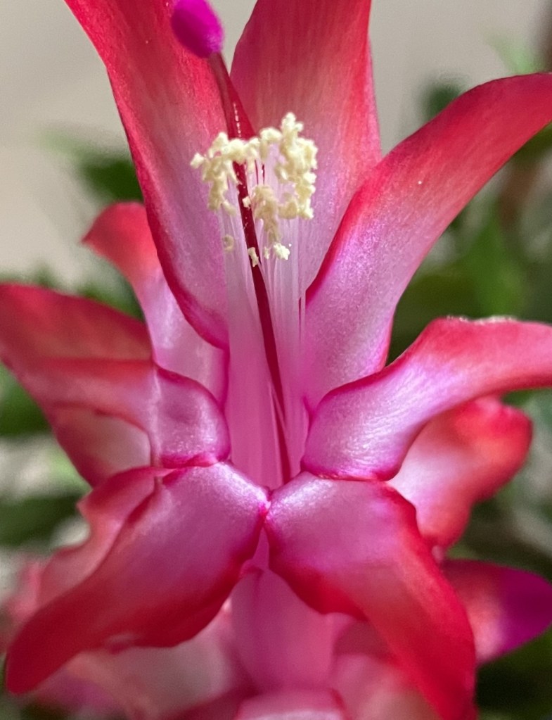 Metallisch glänzend von Magenta bis Kirschrot spreizt die Schlumbergera ihre Blütenblätter in den Raum. Ihr Wunder an Leuchtkraft lässt im novembertrüben Zimmer die Zeit vergessen. Ein wenig nimmt sie den Weihnachtsbaum mit rotaufgesteckten Kerzen in Miniaturform vorweg. Ein wenig lässt sie von saftigen Kirschen träumen, sommerlich süß. Lässt man sich auf sie ein, verliert man sich in der Zeit, sich nach einer schöneren Wirklichkeit sehnend.