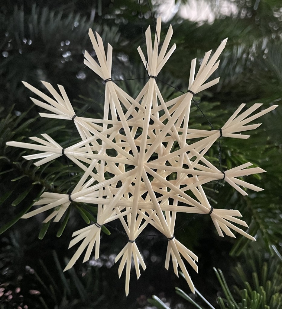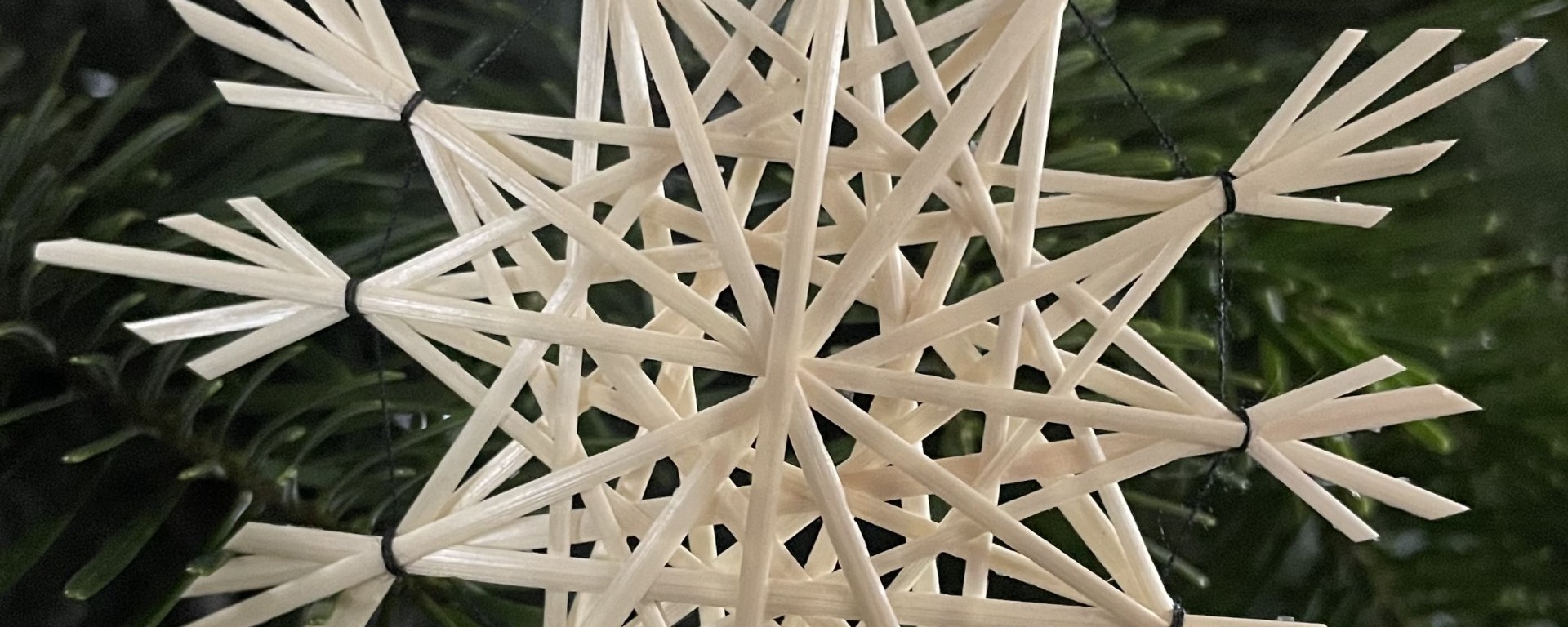 Ein letzter Strohstern hängt am Baum und lädt zu stiller Betrachtung. Von ruhiger Hand gefertigt zeigt er die Kunstfertigkeit alter Tradition. Ob schon die Hirten im Stall zu Bethlehem das Krippenstroh zu Sternen banden und als Geschenk darbrachten? Zart wie das Neugeborene und fragil wie des Menschen gute Vorsätze. Halm für Halm liegt über Kreuz, reihum versetzt sieht das Stroh aus, als würde es sich an Händen halten. Zwölf Zacken, die zusammen um ein Zentrum kreisen. Zwölf Apostel, die sich um ihren Meister scharen. Schon hier ist das Kreuz in ihrer Mitte. Schon werden sie vom Kreuz zusammengehalten. Und schaut man genau: einer der Zwölfe ist gebrochen.