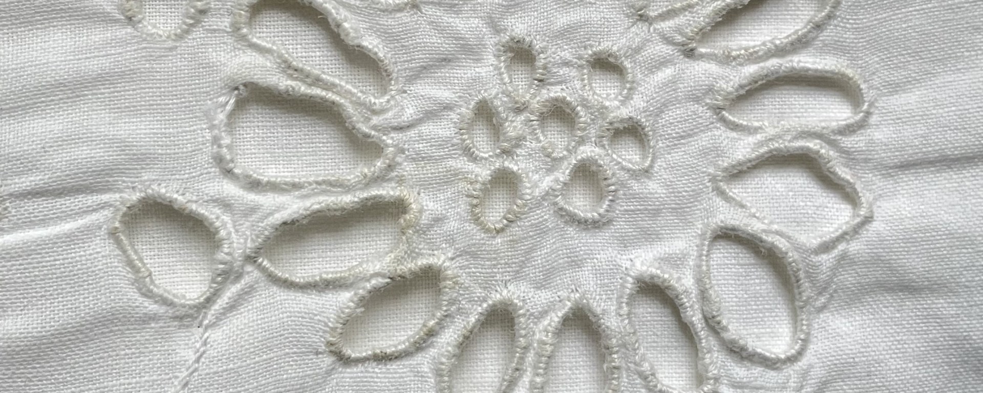 Eine Blume in Lochstickerei, kleinteilige Arbeit von Großmutters Hand. Wie in der Musik die Pausen das Stück bestimmen, sind es hier Löcher, die das Muster bilden. Fehlstellen, die den Rhythmus vorgeben, so dass etwas Neues entsteht. Oder ist es doch der Stoff außen rum, der das Muster trägt? So wie die Noten wichtig sind, um die Pausen hörbar zu machen? Das eine geht nicht ohne das andere. Etwas erschaffen, indem man Teile wegnimmt. Etwas erschaffen, indem man das Richtige stehenlässt. Glücklich, der beides zu unterscheiden weiß!