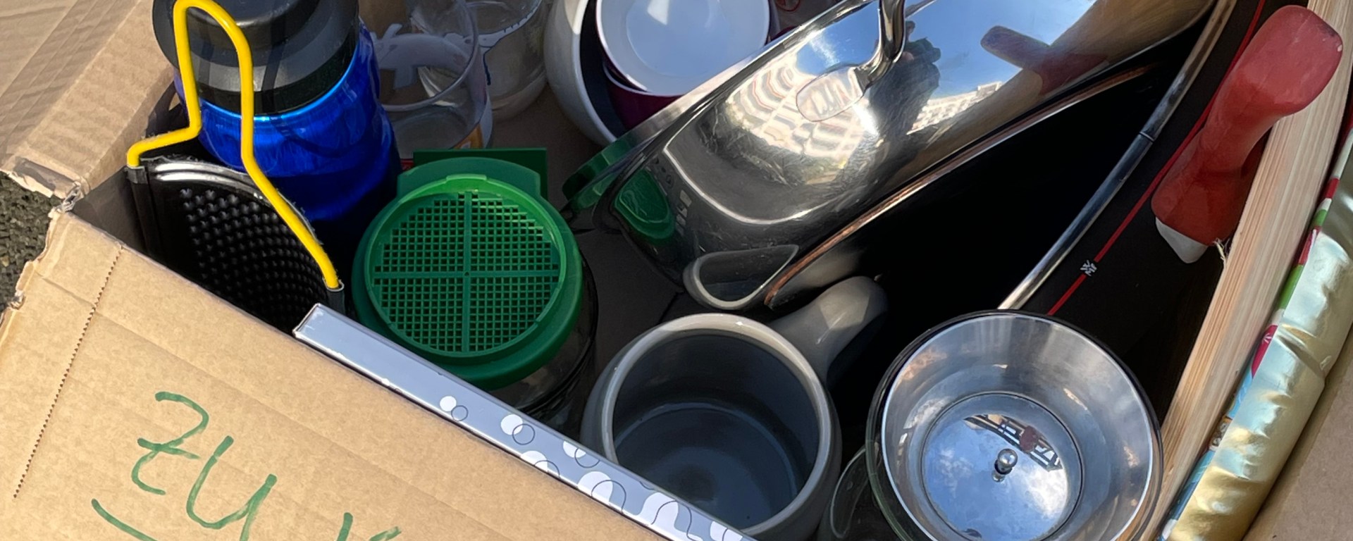 Im Getriebe der Großstadt kann es vorkommen, dass man so für sich hingeht und nichts zu suchen im Sinn hat, aber dennoch etwas findet. Im Schatten sieht man eine Kiste steh’n und schon ist man versucht alles an sich zu reißen. Da heißt es bedachtsam auswählen, nur das nehmen, was man braucht, auch wenn ein Gratisangebot verlockend ist. Und nur das nehmen, was man heil nach Hause transportieren kann. Scherben bringen hier kein Glück. Mögen andere Flaneure, die nichts suchen wollen und dennoch finden, damit glücklich werden.