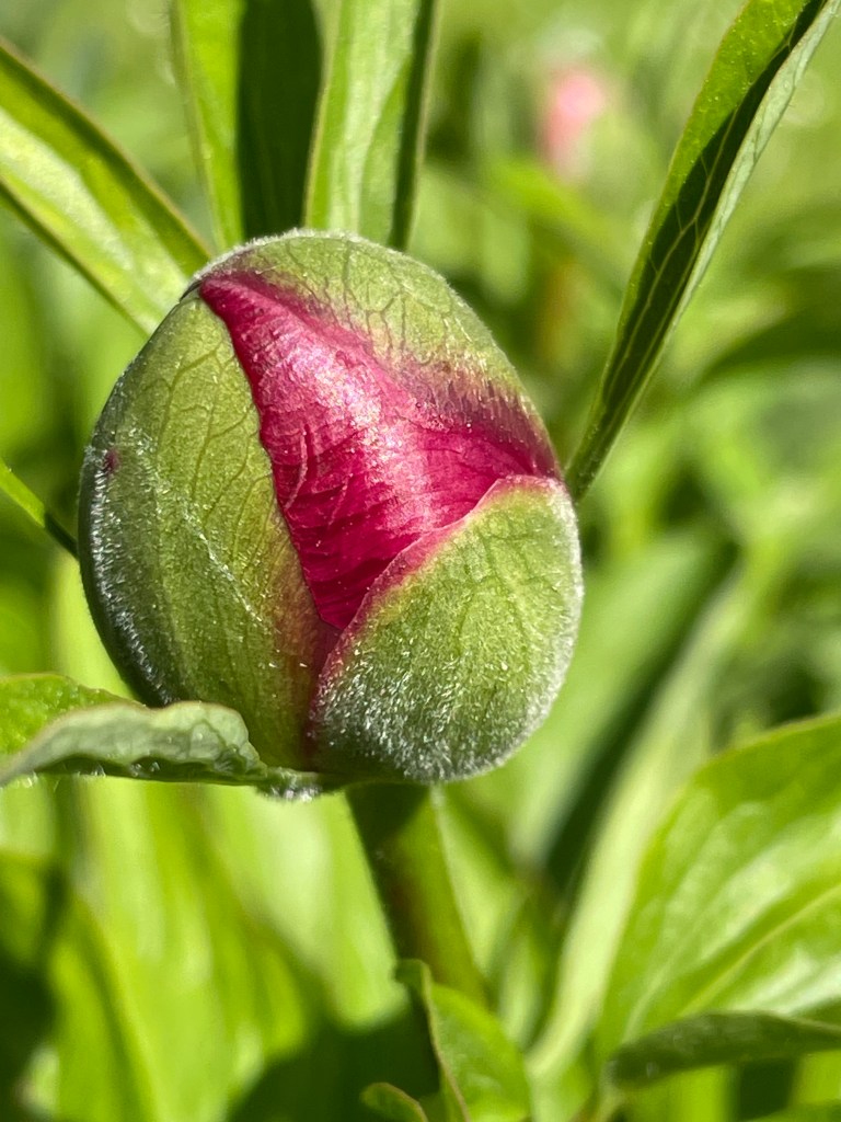 Zart spitz das Rot schon zwischen den schützenden Blättern hervor. In all dem Grün ein feuriger Ausruf! Dabei hat es die wärmende Hülle in kalten Nächten noch nötig, bevor sich in wenigen sonnigen Tagen die Blüte entfalten wird. Wie die behutsamen Hände einer Mutter kommen sie mir vor, diese Blätter. Noch halten sie das Kind umfangen, doch nach und nach ziehen sie sich zurück, um ihm Raum zur Entfaltung zu geben. Und wie eine gute Mutter, werden die Blätter den richtigen Zeitpunkt finden loszulassen, um sich an der Blüte zu freuen!