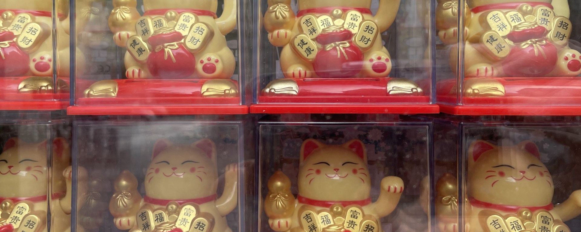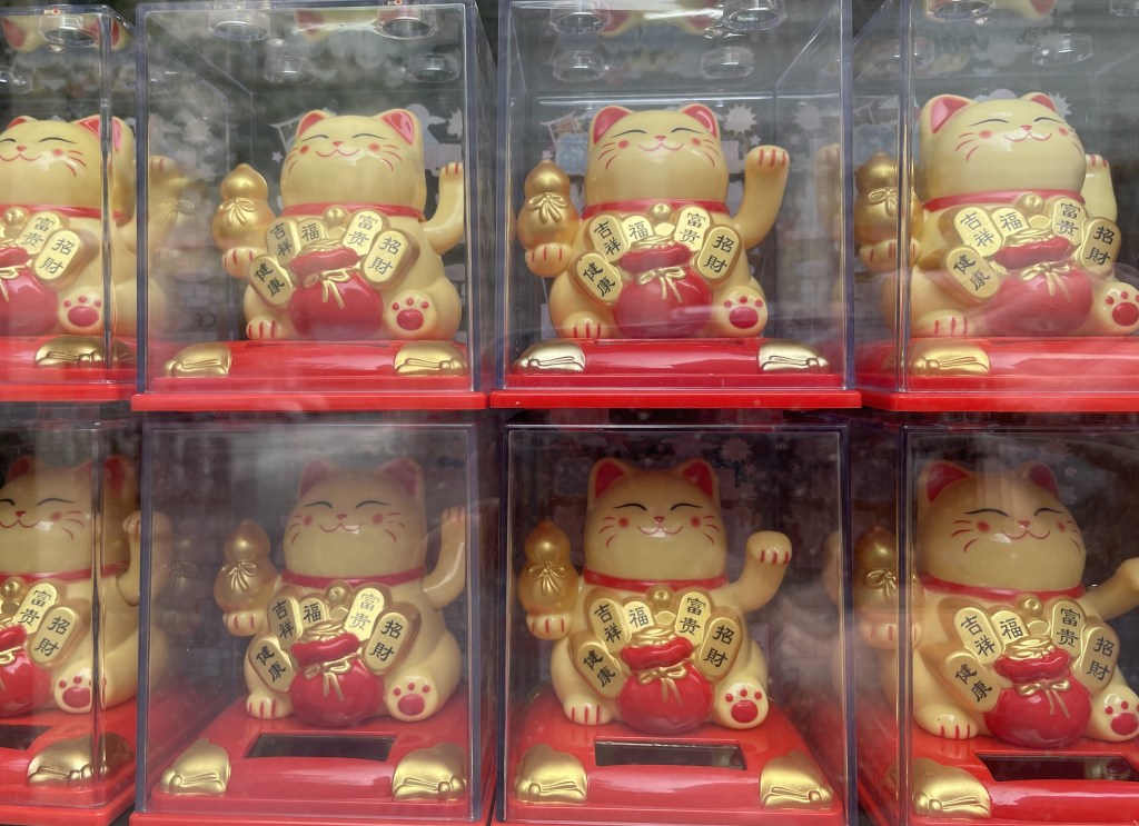 Solarbetriebene Winke-Katzen aus Plastik sind zum Massenphänomen in der ganzen Welt geworden. Je nachdem mit welcher Pfote sie winken, links oder rechts, locken sie wahlweise Vermögen oder Kundschaft an, im besten Fall wohl beides. Dieses Exemplar hat sich eindeutig auf Monetäres spezialisiert. Doch wenn nun jeder so einen Talisman besitzt, wer kann dann noch davon profitieren? Verteilt man begrenzte Ressourcen auf alle, wird sich keiner mehr reich fühlen, hat er doch genauso viel wie sein Nachbar. Da suche ich mein Glück lieber gleich in der Bescheidenheit und verzichte auf den Kauf dieses Glücksbringers.