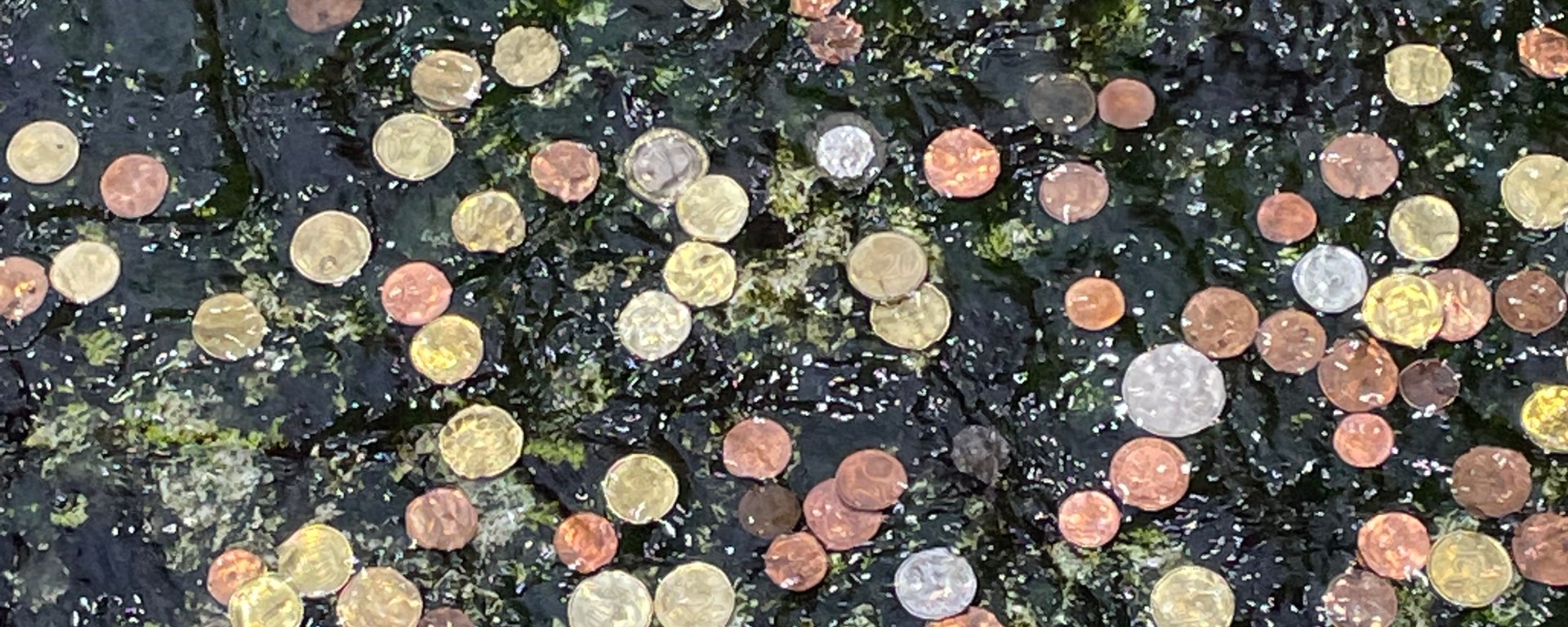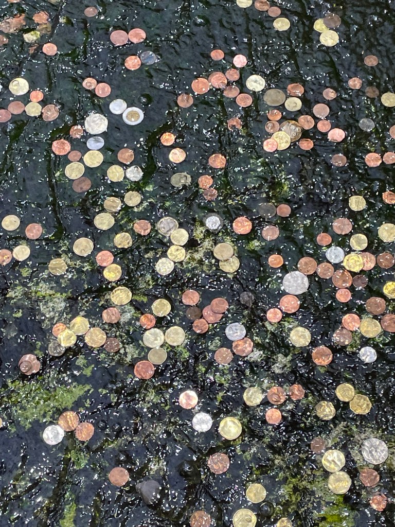 Golden, silbern und kupfern glitzern die Träume und Sehnsüchte der Menschen im tänzelnden Wasser. Kaum ein Brunnen an tourismusträchtigem Platz, der heutzutage noch von Münzwürfen verschont bliebe! Wassergottheiten mit Gaben zu besänftigen mag in alten Zeiten als sinnvolle Handlung angesehen worden sein, aber was bringt Menschen heutzutage zu ähnlichem Tun? Steckt dahinter der Wunsch nach Rückkehr, wie es für den Trevi-Brunnen reklamiert wird, oder ist es nur das Bedürfnis, eine sichtbare Spur zu hinterlassen? Ein „Ich-war-da!“ statt ein „Ich-komme-wieder!“