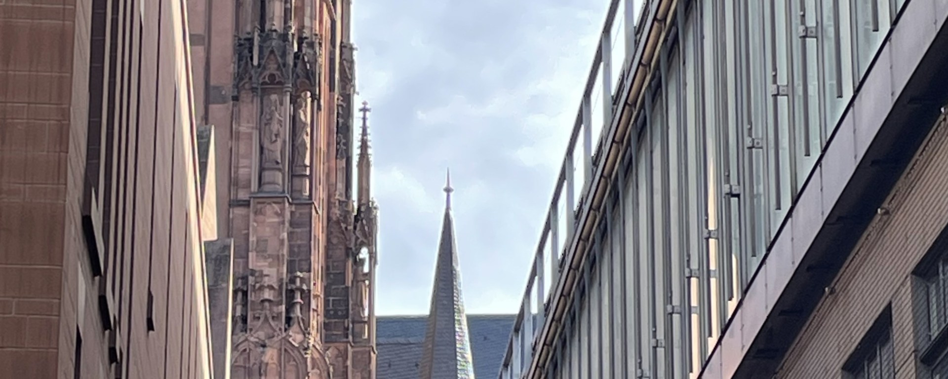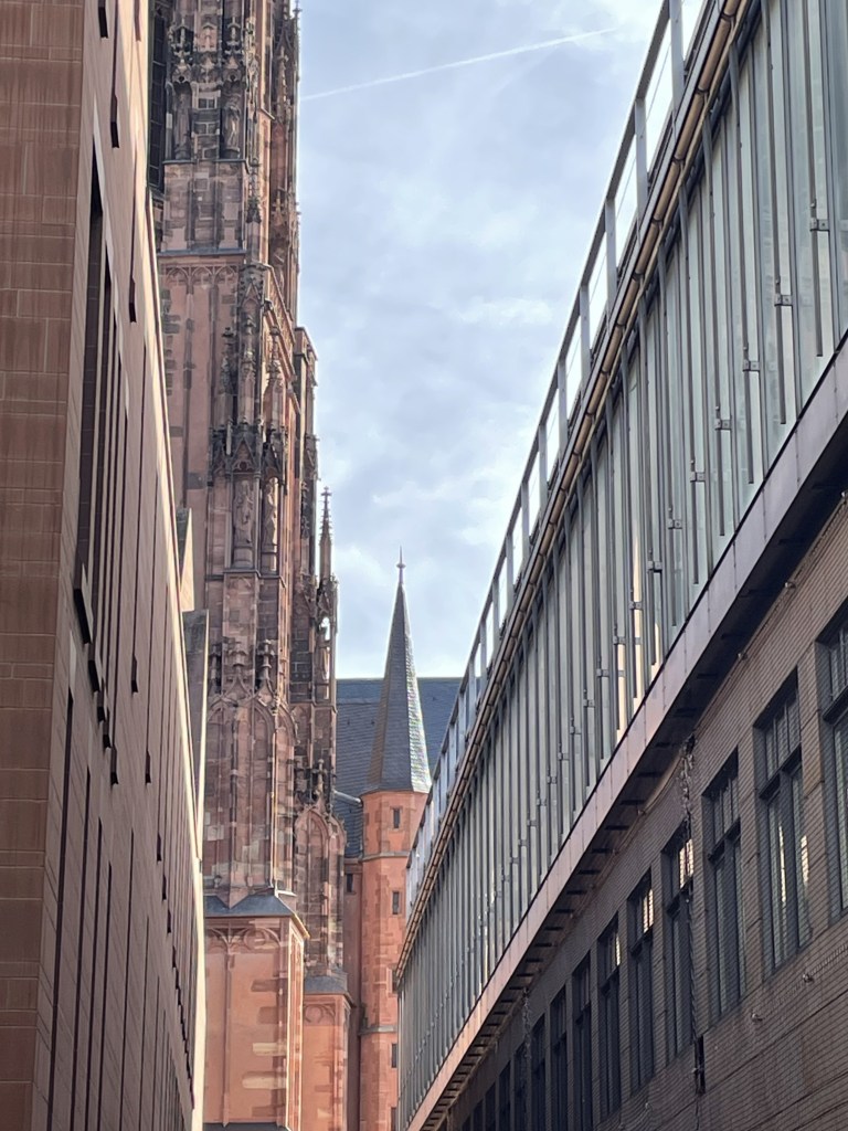 Umfangen von Gebäuden der Gegenwart geht der Blick zurück zum mittelalterlichen Dom. Es ist wie ein Blick durch verschiedene Schichten in eine vergessen geglaubte Vergangenheit. Wie ein Riegel liegt der moderne Bau, die Horizontale betonend als wäre er Ausdruck einer Art Erdverbundenheit. Ein Streben nach Irdischem. Doch ist uns allen die Bewegung nach oben eingeschrieben, das Streben nach dem Transzendenten, wie es das hochstrebende Gotteshaus symbolisiert. Auch wer es längst überwunden glaubt, trägt es im Verborgenen in sich. Ein Sediment der Vergangenheit auf dem Grunde unserer Seele.