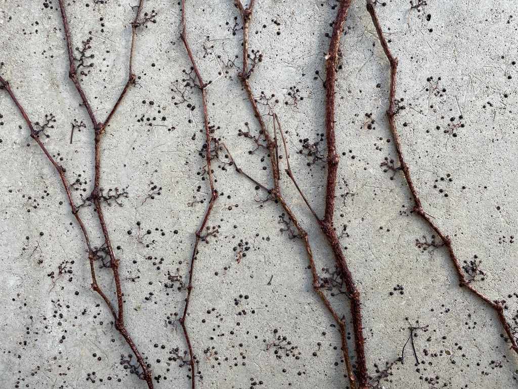 Haben wir gerade noch in den Herbstfarben des wilden Weins geschwelgt, sehen wir uns nun mit der bitteren Wahrheit des Todes konfrontiert. All das Bunte, Lebendige hat sich verabschiedet, zurück bleibt ein verhärteter Rest in gedeckten Tönen, der es nicht mehr vermag die brutale Betonwand zu kaschieren. Natürlich könnten wir uns ins Gedächtnis rufen, dass immer noch Leben darin steckt, dass wir nur Geduld haben müssen, bis es mit lichtem Ruf wieder daraus hervorbricht. Doch sollten wir auch einmal kurz innehalten und den Moment des Abschieds und der Trauer zelebrieren, statt ihn mit lautem Geschrei künstlich zu überdecken. In der Stille steckt die Möglichkeit zu sich selbst zu finden.