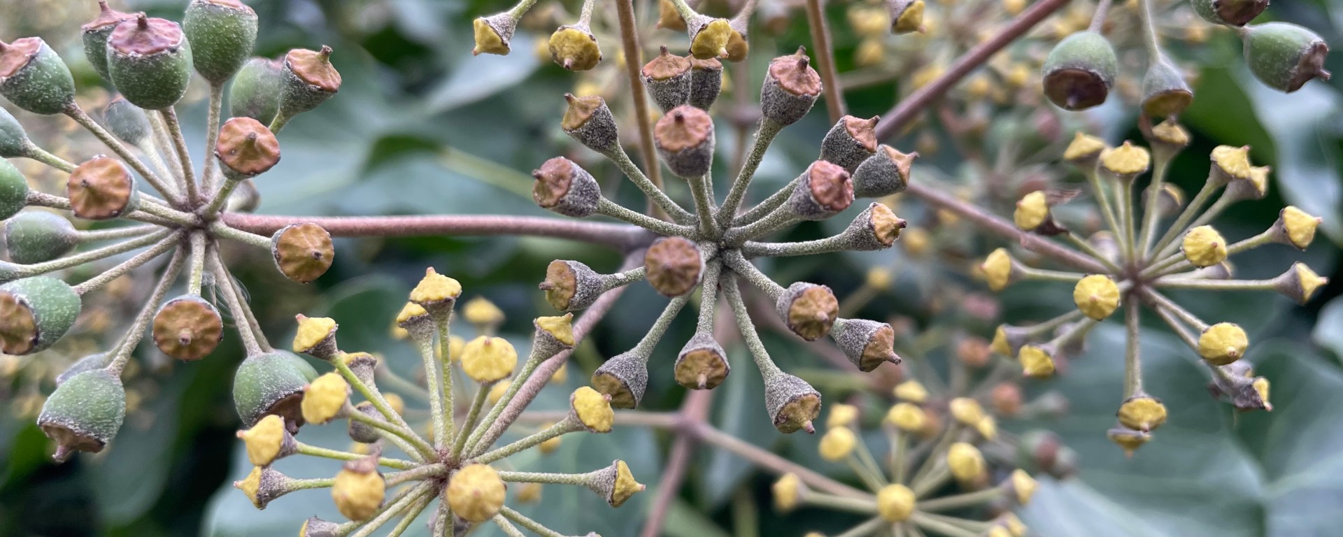 Gerne beklagt sich der Mensch über das winterliche Dasein. Er träumt von Winterschlaf und sehnt sich nach dem Erwachen der Natur im Lenz. Doch auch in der dunklen Jahreszeit gedeiht das Leben in aller Heimlichkeit weiter. An Hauswänden, Mauern und Baumstämmen windet sich immergrün der Efeu empor und bringt Frucht zu ungewohnter Zeit. Wie die Sterne uns durch die Kälte des Weltalls Licht senden und uns zum Träumen bringen, stellt der Efeu seine sternengleichen Fruchtstände in die Kälte, damit sie den Vögeln bald Nahrung geben. Auch wir haben zu Unzeiten solche Hoffnungsspender nötig.