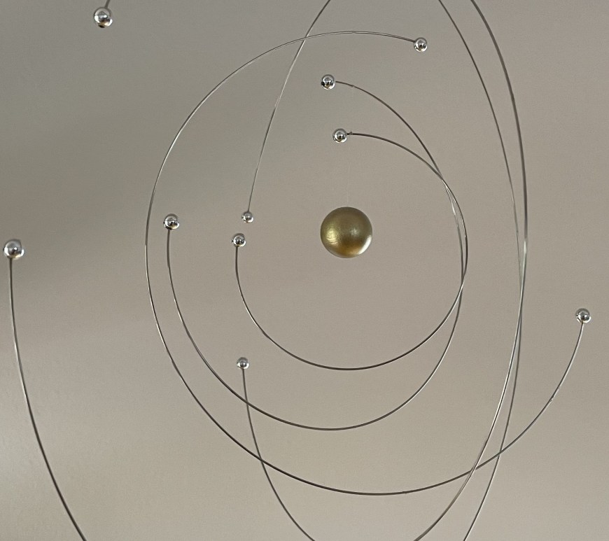 An dünnen Fäden, unsichtbar befestigt, hängt das Mobile. Im Aufwind beginnt es sich sanft zu bewegen. Silberne Ringe, sich um einen goldenen Kern drehend, bilden eine Abstraktion des Bohrschen Atommodells. Kügelchen, die in festen Abständen ihre Kreise ziehen, zwischen sich leeren Raum aufspannend. Auch wenn es physikalisch gesehen veraltet ist, zeigt es uns doch das wahre Gesicht der scheinbar festen Materie. Das allzu Starre, welches … Beweglich weiterlesen